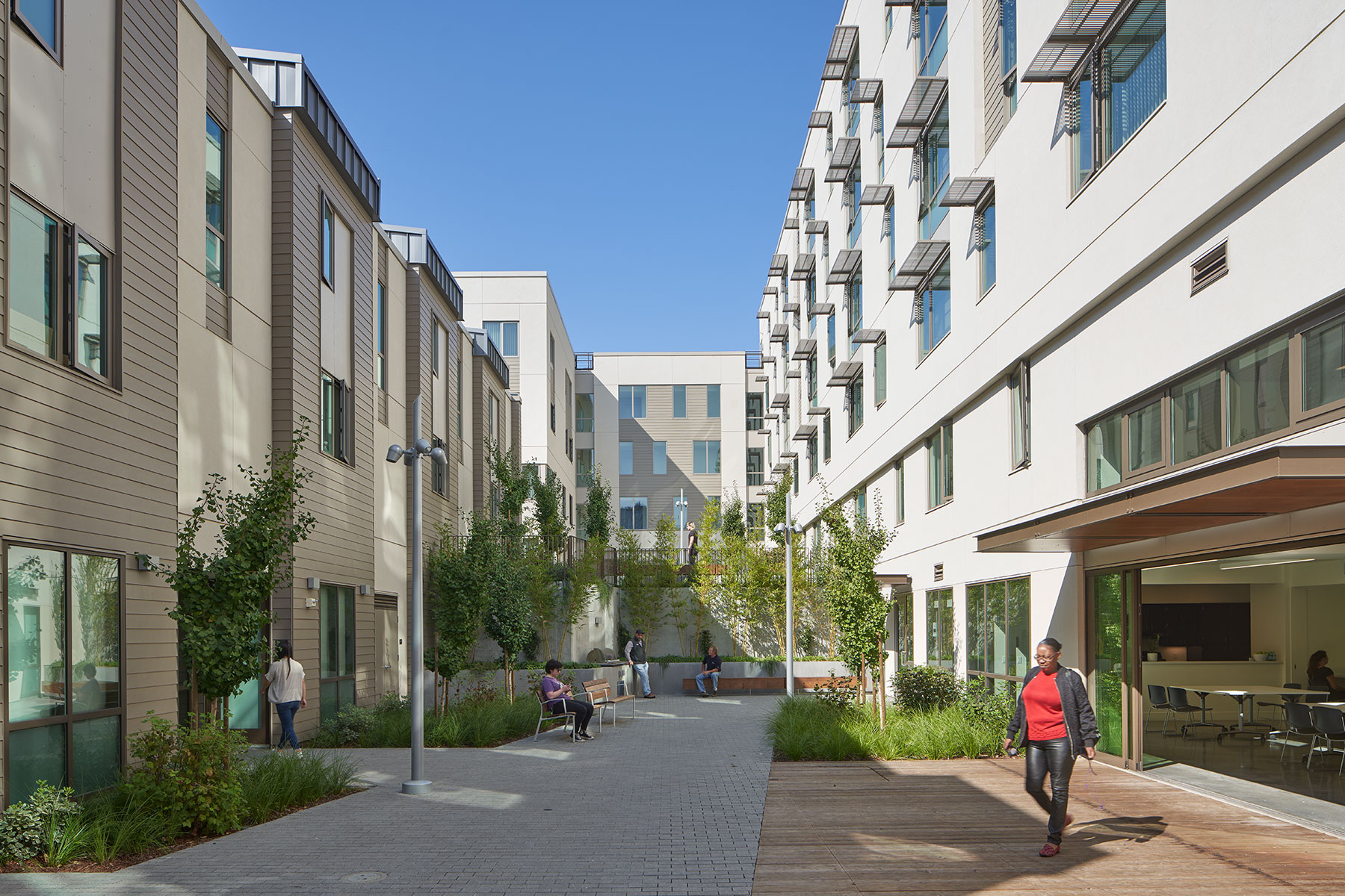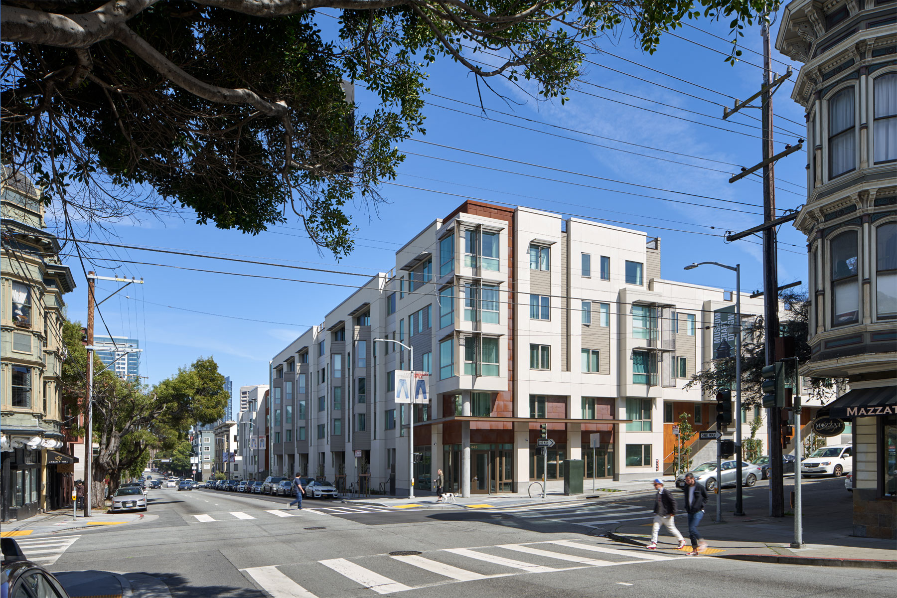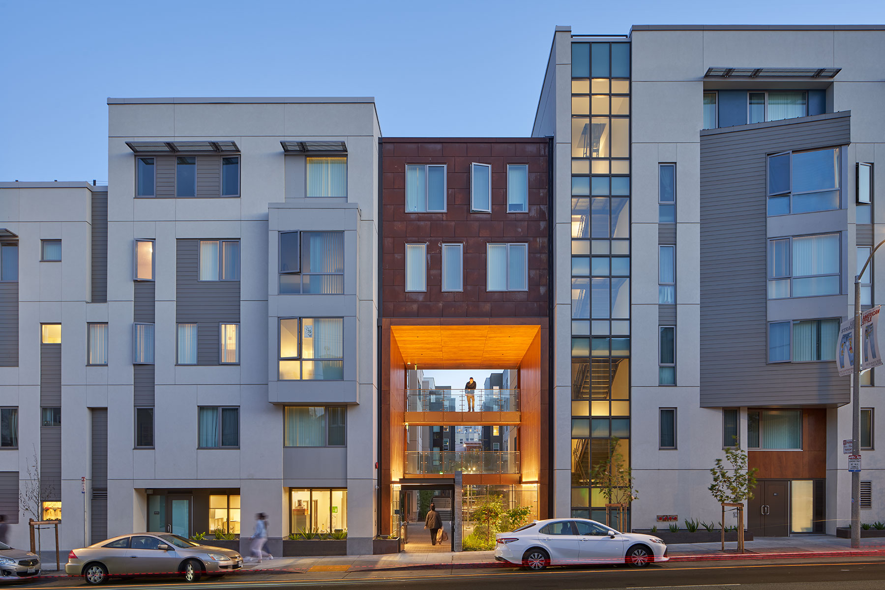 The collaboration between Mercy Housing California and San Francisco Housing Development Corporation in partnership with Leddy Maytum Stacy Architects and Paulett Taggart Architects provides an affordable residential community for 108 low-income families, of which 33 were formerly homeless. Neighborhood serving retail, alley townhouses, bay windows, residential stoops and a dramatic mid-block pedestrian portal passageway are combined to reinforce and enhance the historic pedestrian-oriented urban neighborhood. A series of outdoor amenities are woven into various levels of the residential complex including a daycare play zone, barbeque area, community garden and a roof level terrace with views of the neighborhood skyline.