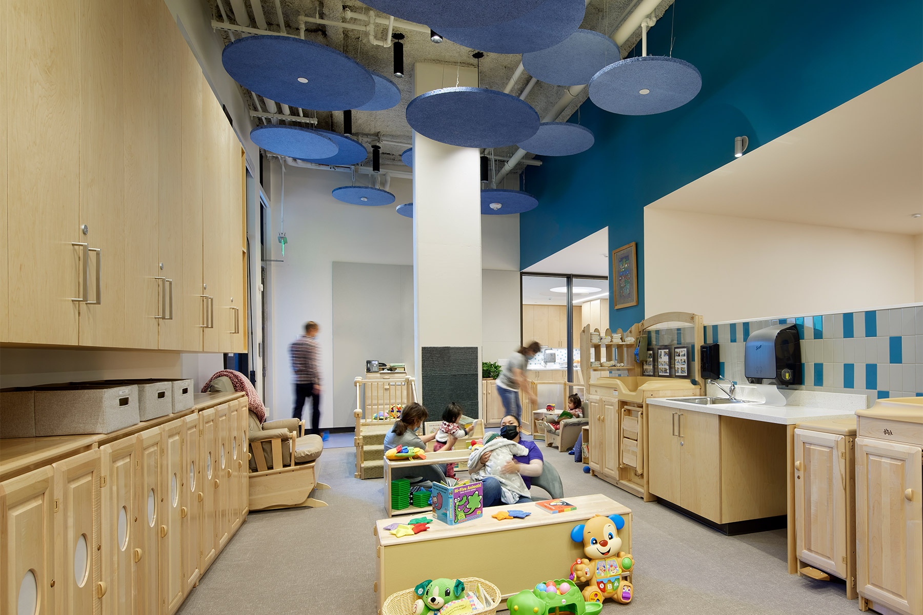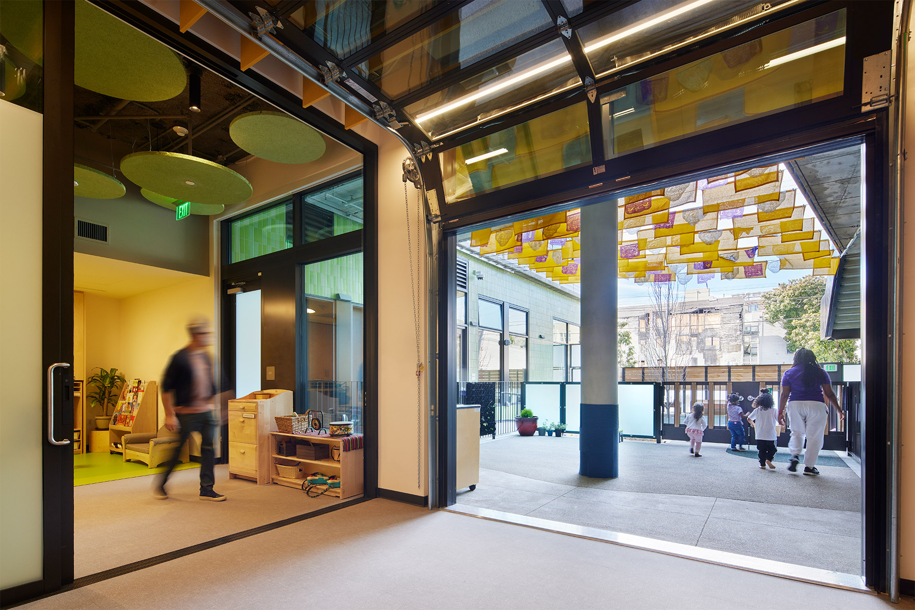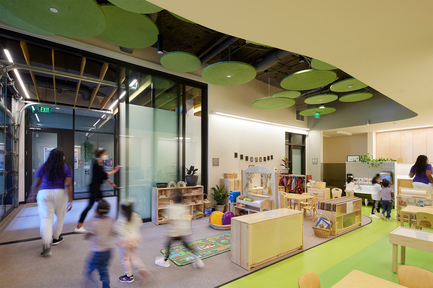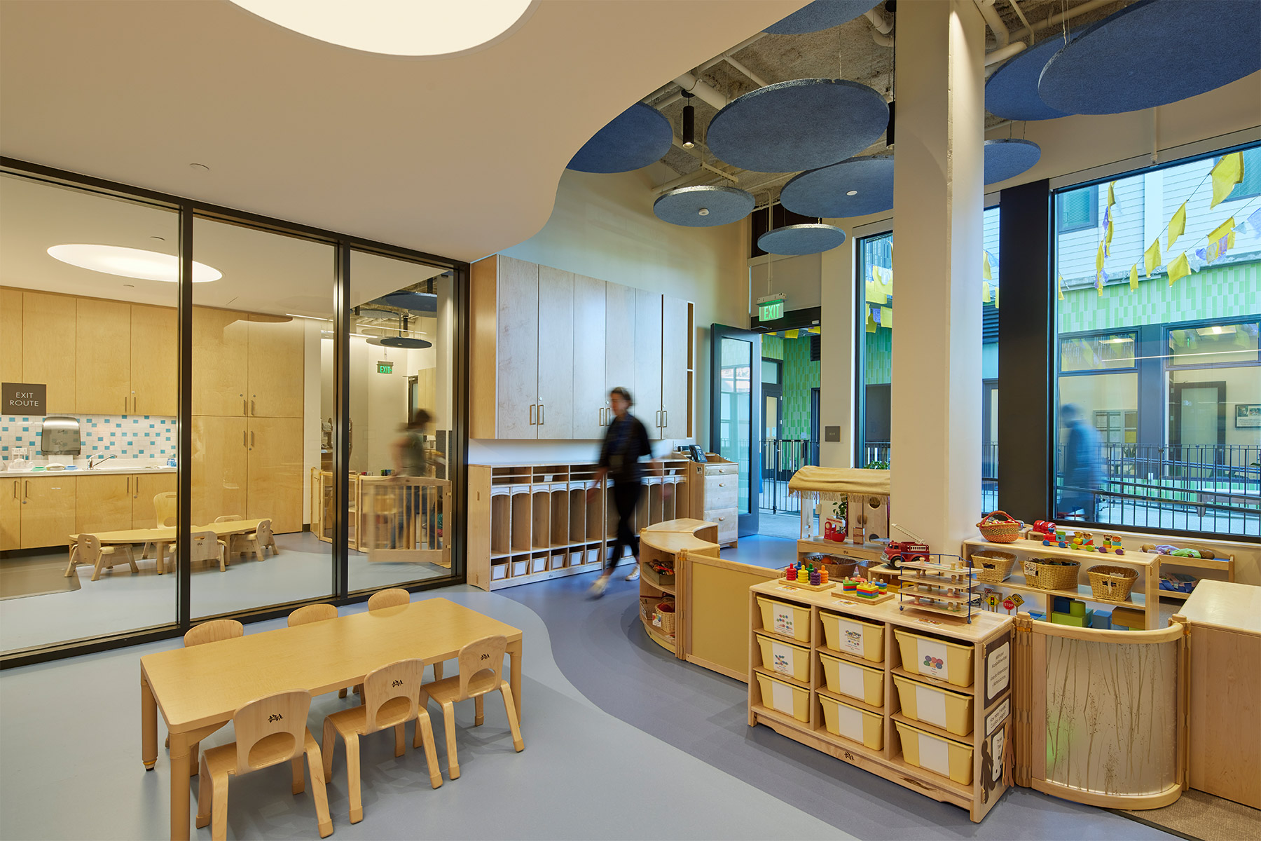 In tandem with design and construction of 2828 16th Street, LMSA provided tenant improvement services of a 4,600 SF ground-floor commercial space for use as the Felton Solmar Early Childhood Education Center. As Felton's first site co-located in a 100% affordable housing building, the Solmar Learning Center provides a safe space to learn in an community designed to nurture the whole family. The interior space features 3 classrooms (1 infant, 1 toddler, and 1 pre-k), teacher and administrative support spaces, and a community room. An overhead roll-up door can be opened to connect the community room with the 930SF outdoor play yard for larger events.