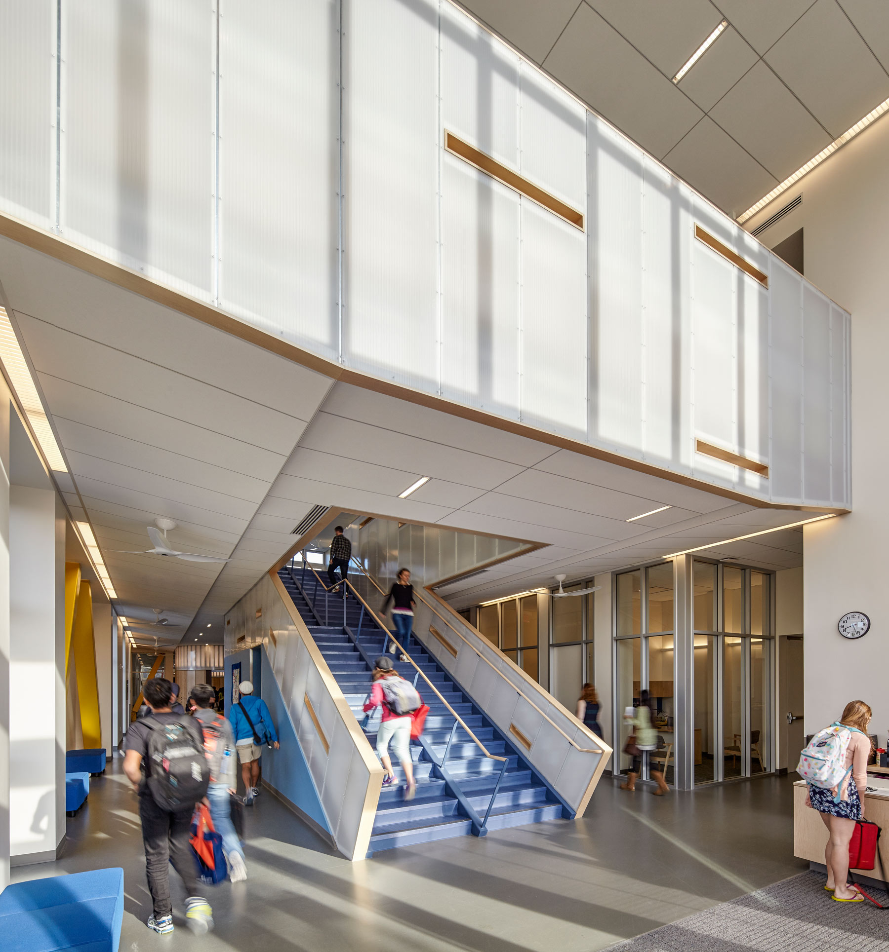 Located in a new transit-oriented mixed-use development in San Mateo, California, the LEED Gold certified project optimizes community connection, reduces energy and water use, and limits automobile use. Flexible learning spaces are generalized and distributed to create social / educational territories that de-emphasize association with particular knowledge domains; they “break down the silos” of learning. Designed to use 65% less energy and 50% less water than a typical high school, the campus is conceived as a living laboratory that inspires student research into low-carbon, resource-efficient learning and living.