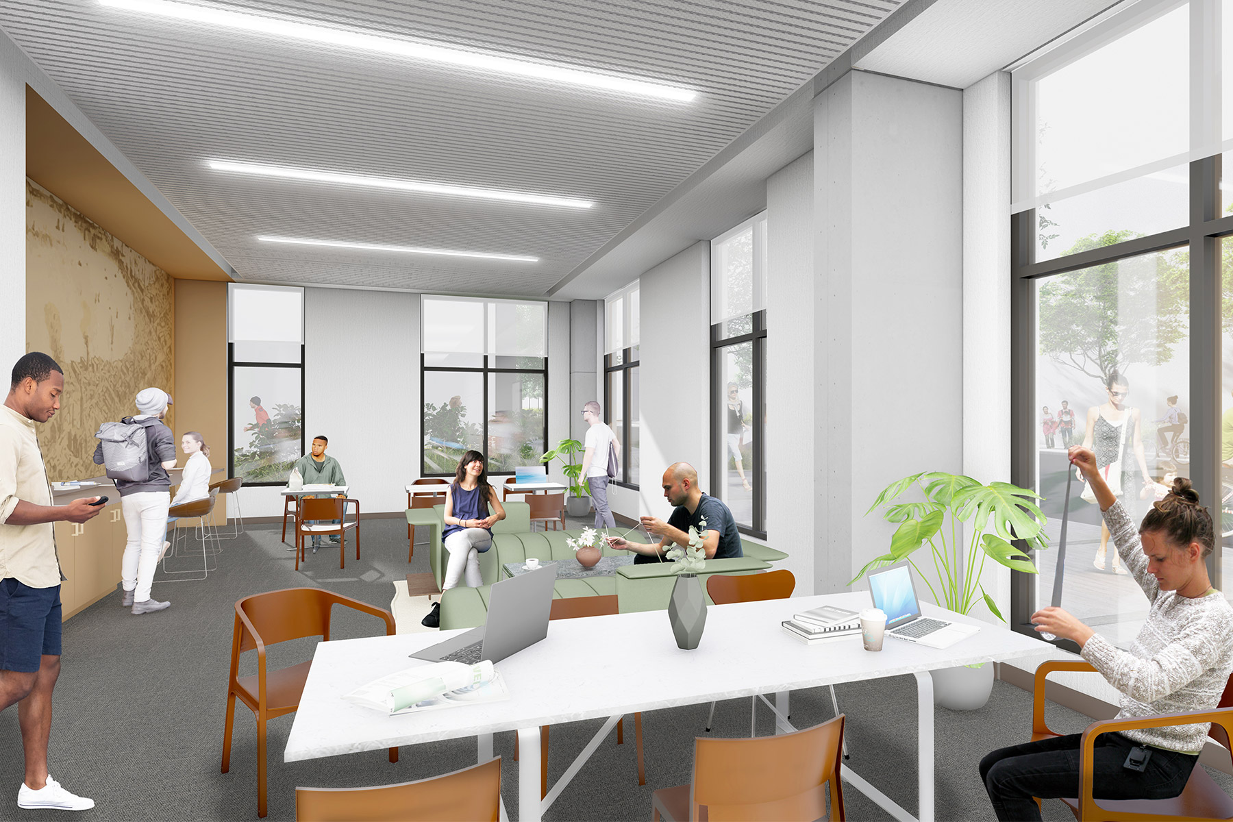 The design of Block 7B draws inspiration from the industrial quality of the historic site. The building’s massing is informed by its corner location and its relationship with the adjacent tower at Block 7A, designed by Foster + Partners. LMSA worked closely with the Foster team to ensure that the two buildings, which share a mid-block passageway and courtyard, complement one another while maintaining their own architectural vocabulary and intent. The shared courtyard passages will provide streetwall permeability and pedestrian interest.