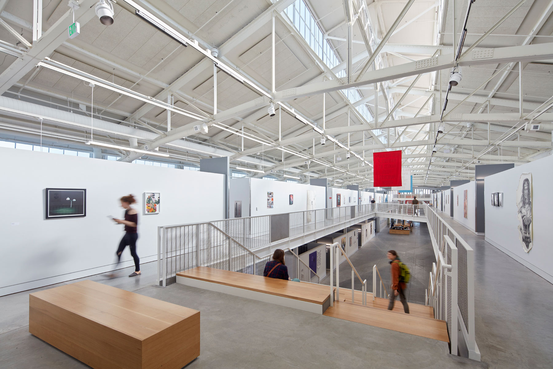 In Phase I, the historic shed was restored and seismically upgraded with integrated sustainable building systems including a 255KW rooftop photovoltaic solar system. In Phase II, LMSA transformed the interior volume into a new arts campus for SFAI which includes 160+ studios, public exhibition galleries, performance installation rooms, multipurpose teaching spaces, a black box theater, and a workshop. The renovation of the historic U.S. Army warehouse preserves the industrial integrity of the landmark structure in strict conformance with the Secretary of the Interiors Standards for Historic Rehabilitation, while creating a dynamic new hub for arts activities at Fort Mason Center. The new SFAI Fort Mason campus joins the historic SFAI Chestnut Street campus to radically advance SFAI’s commitment to positioning artists at the center of public life in the Bay Area and globally.