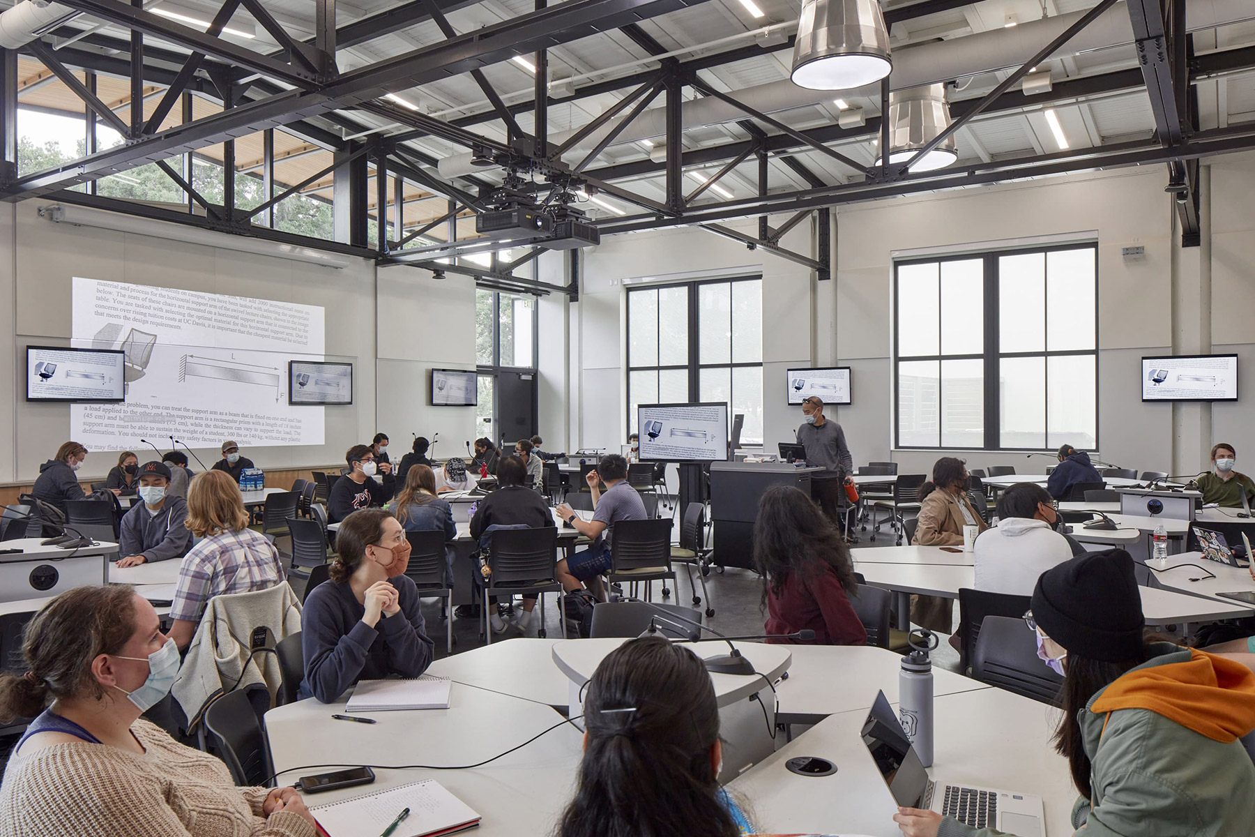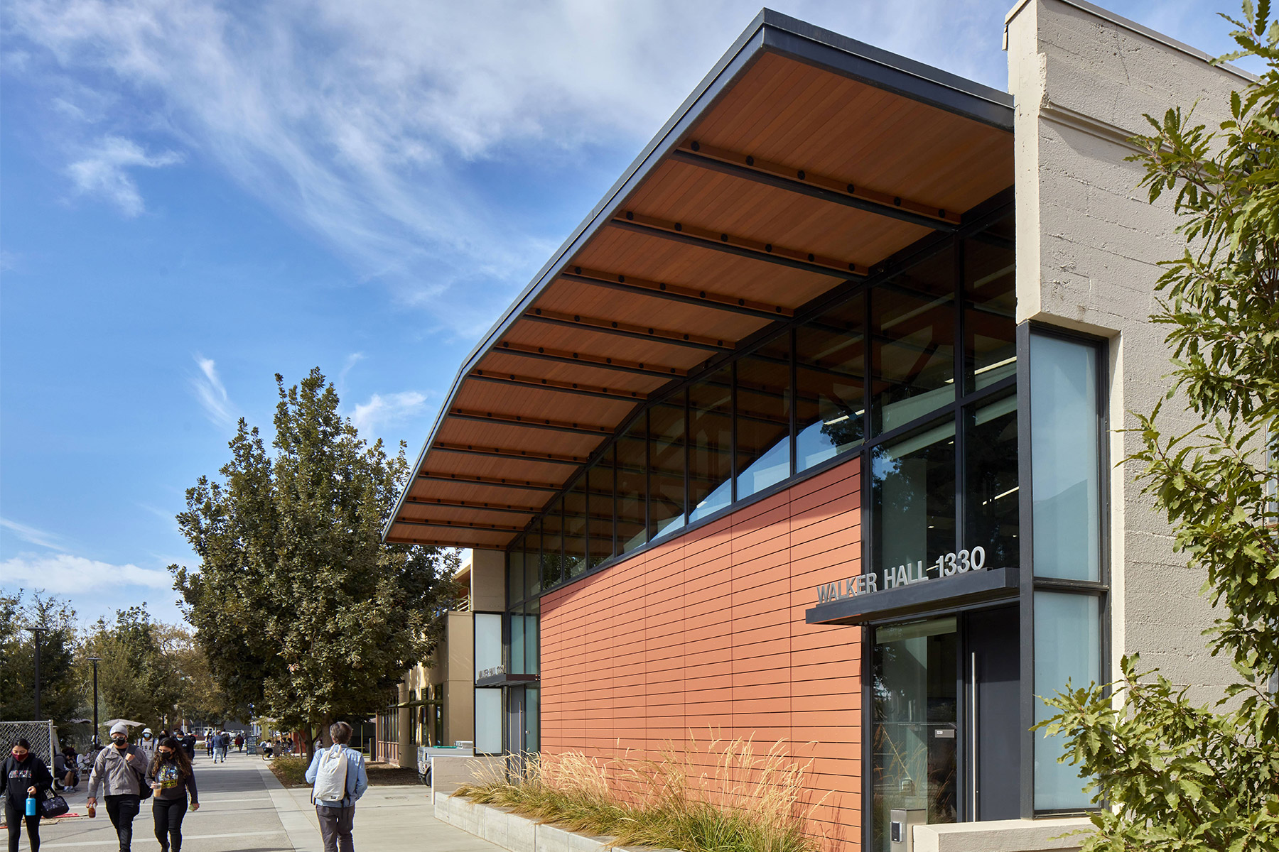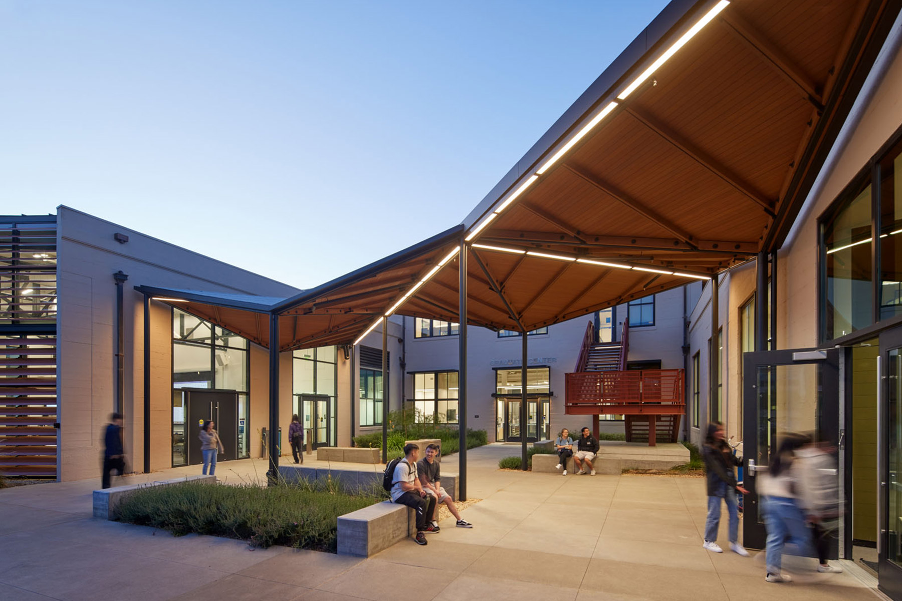 The revitalized Walker Hall provides a new Graduate Student Center that promotes interdisciplinary interactions and builds community for UC Davis graduate students and postdoctoral scholars. It supports graduate student success by providing a variety of spaces for formal and informal gathering, as well as mentoring, advising, and mental health counselling. The three former machine shop wings were repurposed as a two-hundred-seat lecture hall and two large active learning classrooms. Facing southward onto a new Walker Promenade, these flexible, media-rich spaces are available to classes from across the university. Their transparency reveals the hum of academic activity within and enlivens the pedestrian experience at the campus core. The educational program extends outdoors to two landscaped courtyards framed by new sculptural canopies that serve as thresholds to the new Graduate Center and provide shelter from extreme weather.