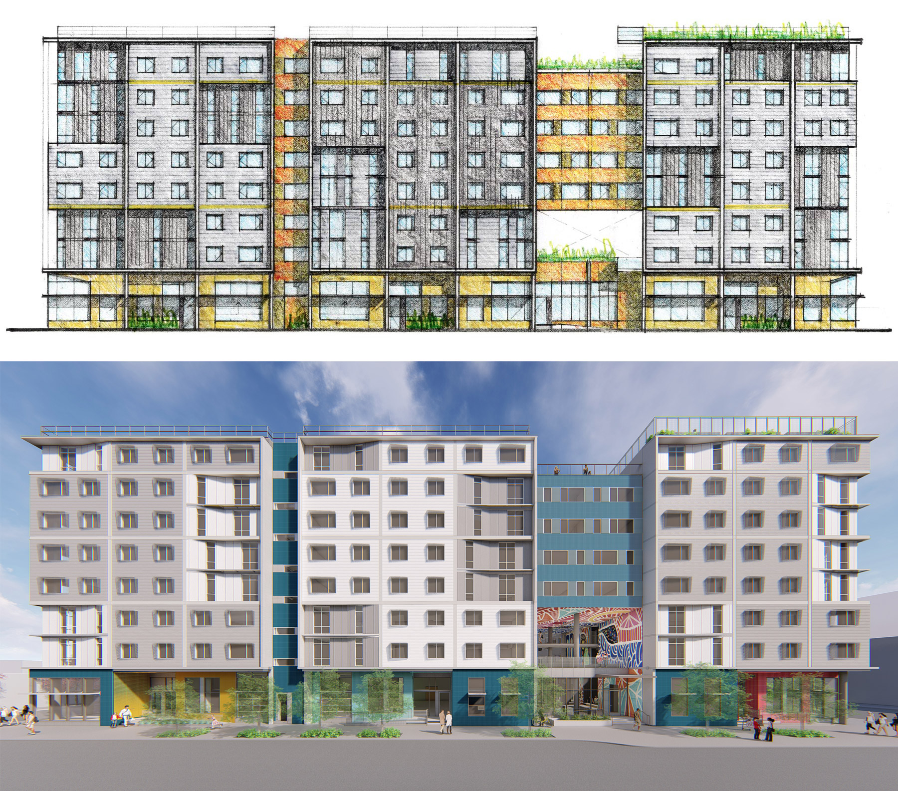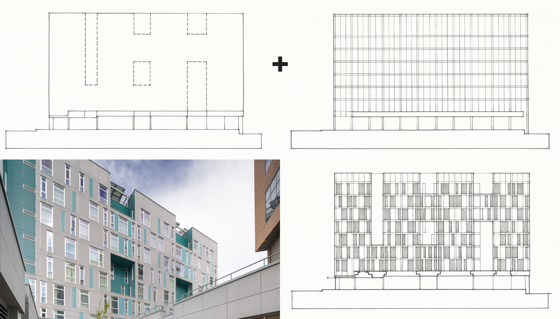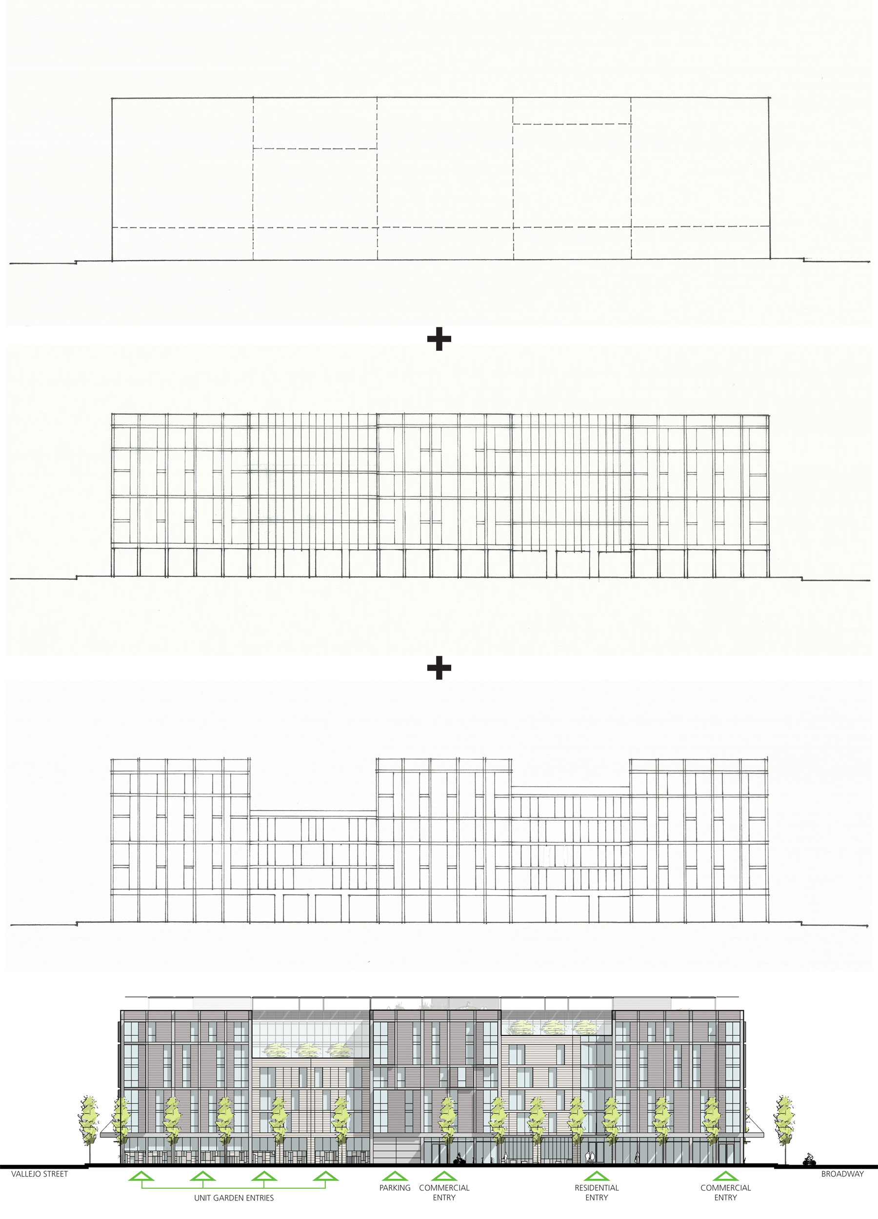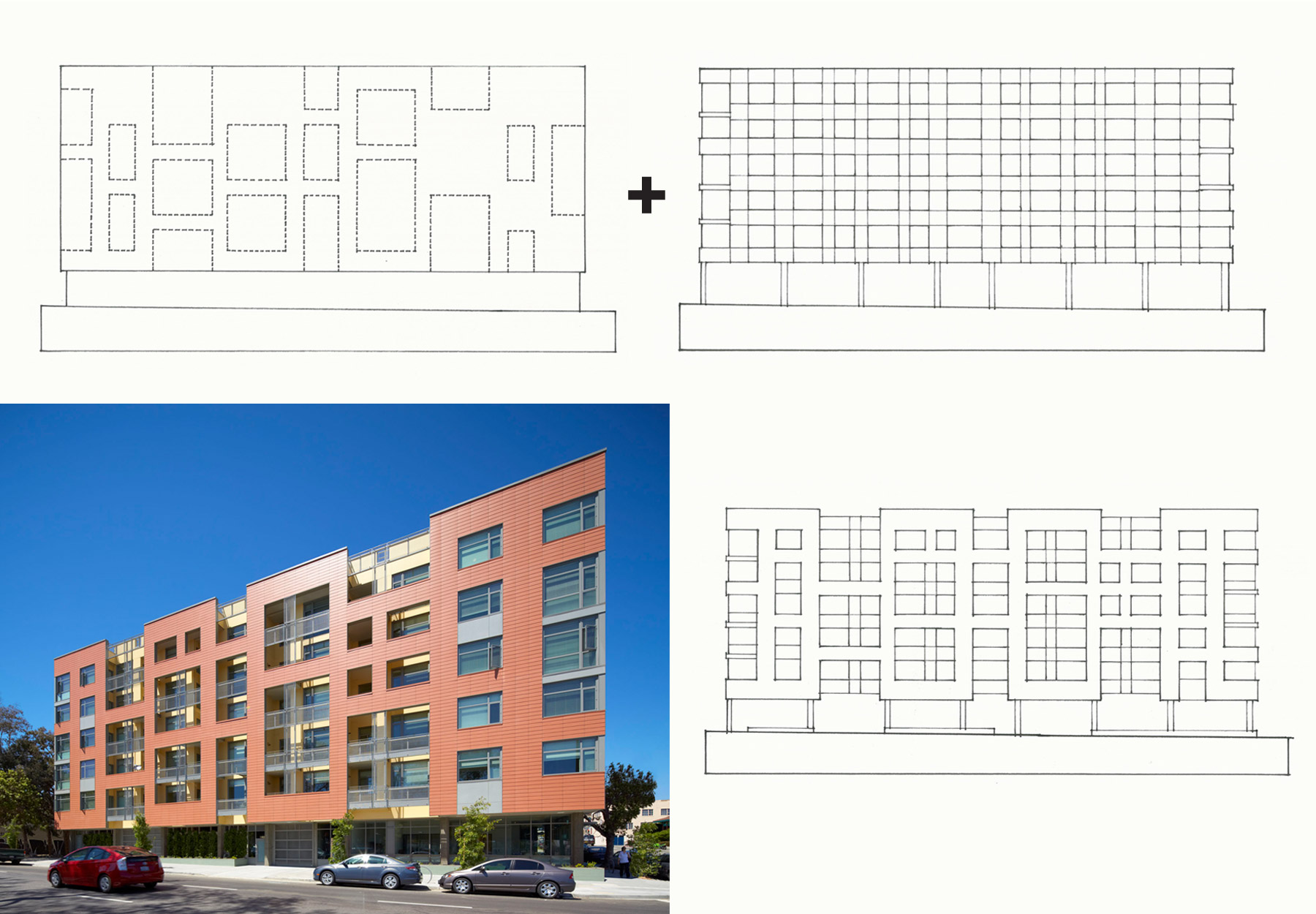 Our project on Folsom Street in the Mission District is in a very different neighbor than the Broadway site, with a different neighborhood identity. Can you guess the formal structure acting on this facade?