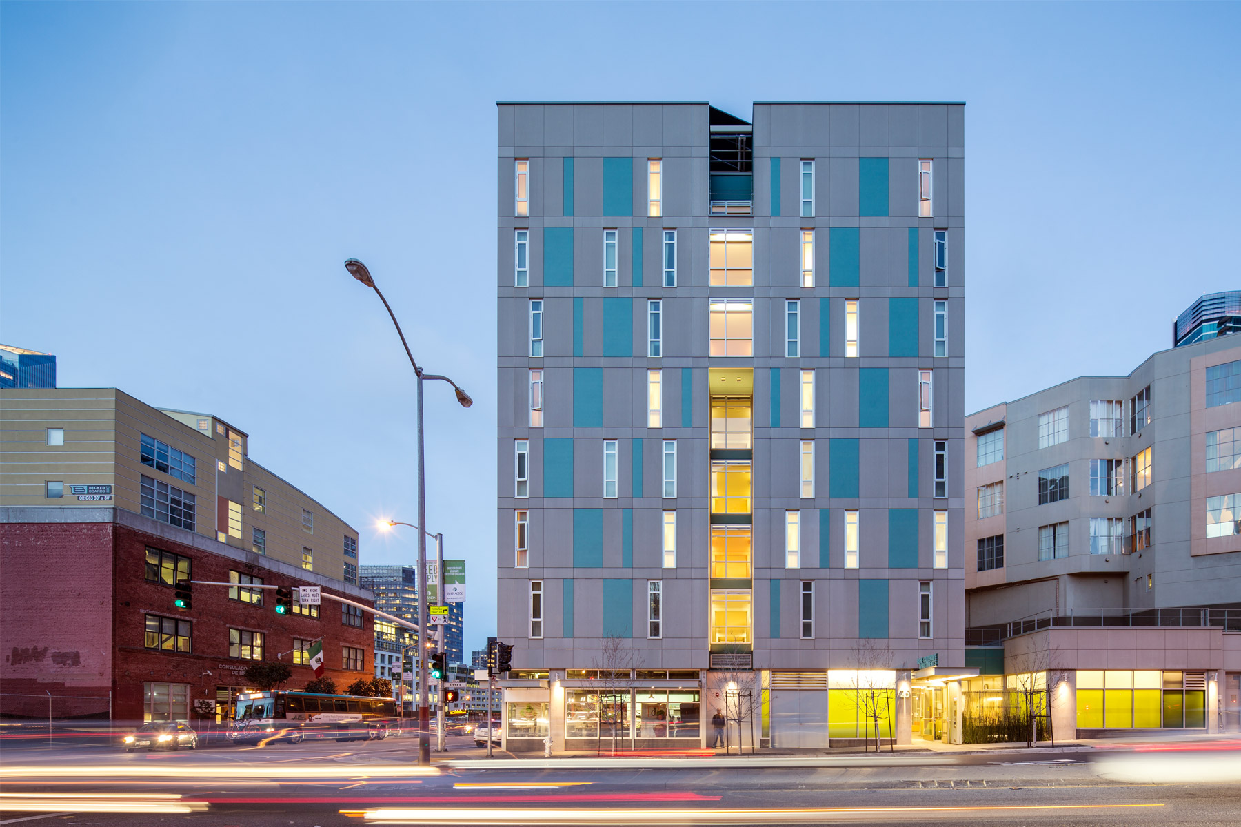 Some of the tools we use to tackle the design of the facade are offset rhythm and patterns of windows, bold cutouts, and color variation. Often these strategies are combined or layered to maximize variation and to create visual interest. For example, Rene Cazenave Apartments (RCA), which occupies an urban site adjacent to the Bay Bridge freeway exit into San Francisco, is designed to create a distinct urban experience through the composition of the facades. The structural bay is divided into three parts along Folsom Street. Two sizes of windows shift along the grid. Overlaid on this system, a pattern of notches cut through both sides of the facade, punctuating the active skin and providing a larger rhythm of openings across the building.