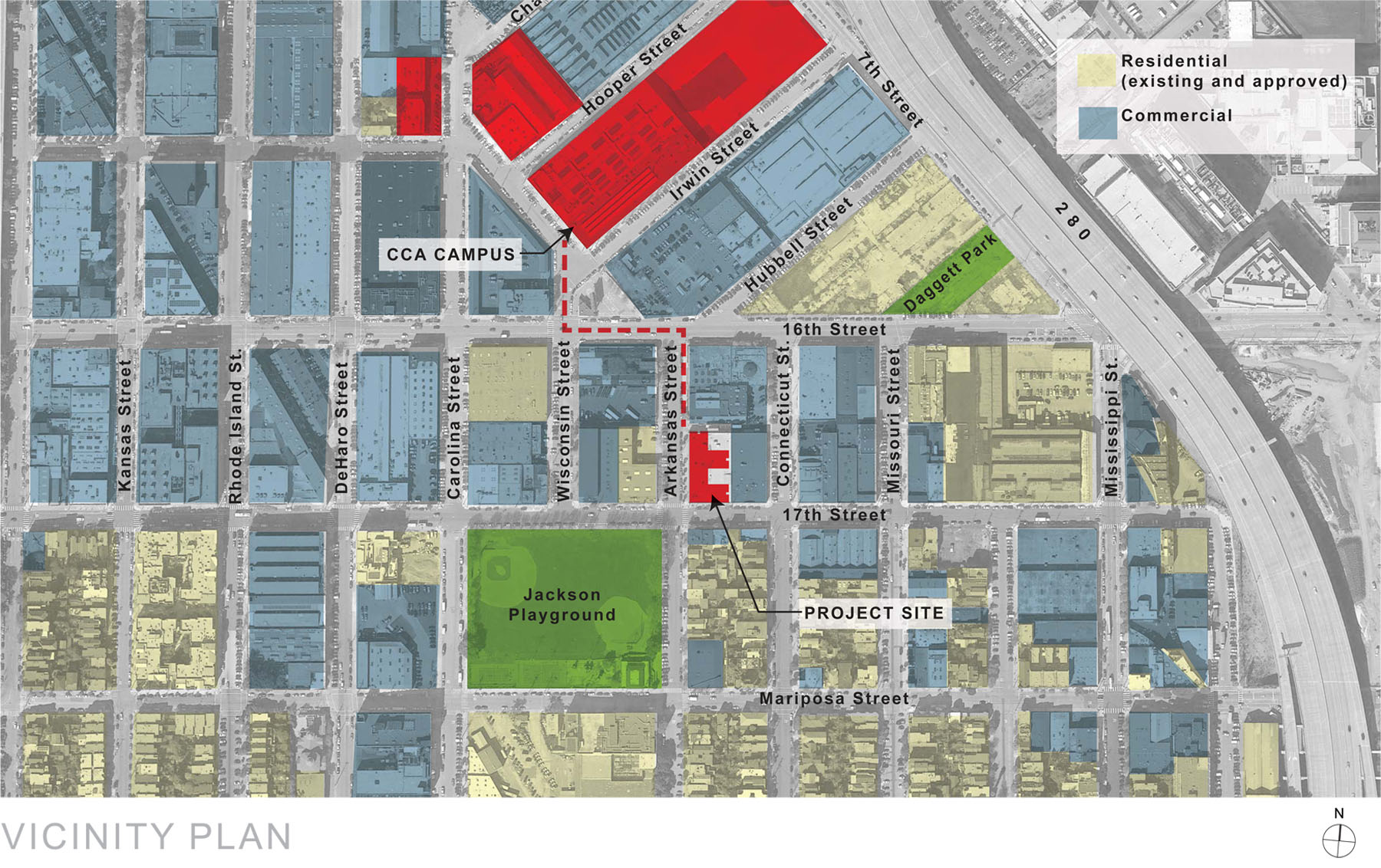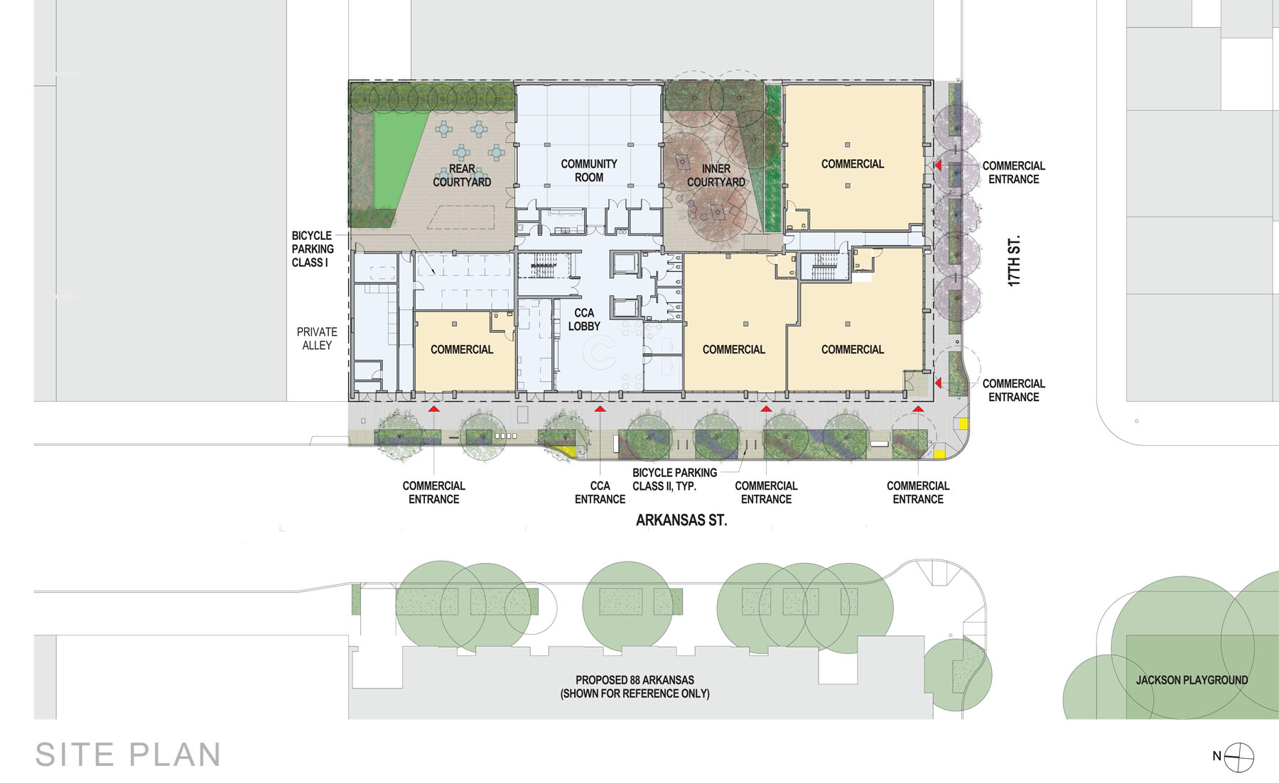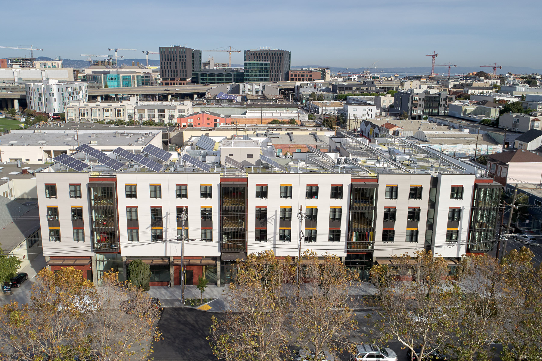 The project site, 75 Arkansas Street, is at the edge of a large scale semi-industrial district to the north and the smaller scale Potrero Hill residential neighborhood to the south. The building was designed to work at both scales, reading as one large building, like the warehouses to the north, but articulated as a number of distinct volumes with projecting bays to complement the 25-foot wide row houses of Potrero Hill.