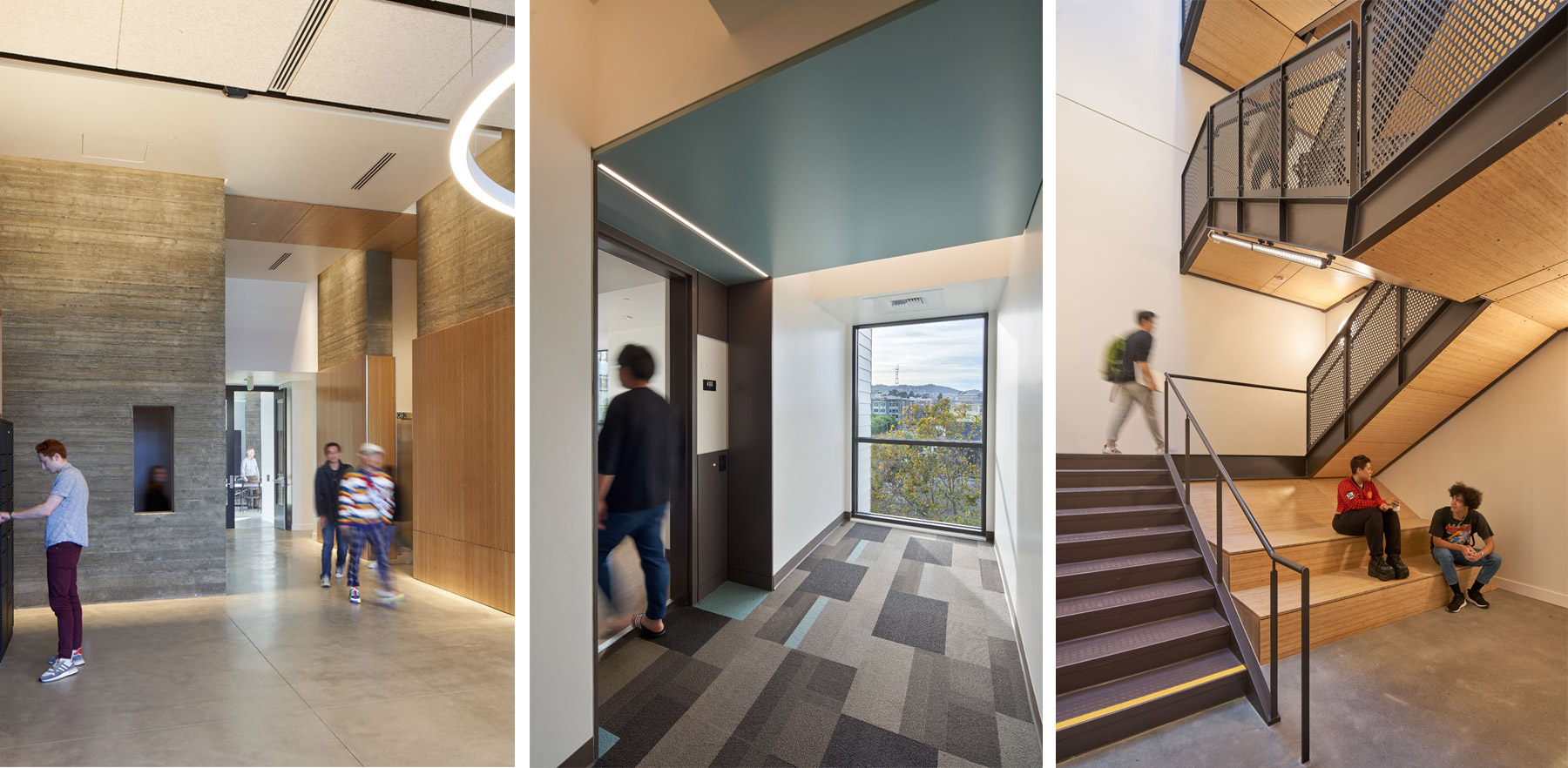 On the ground floor, the main entrance connects directly to a large community room that can be used for student and community events. Two courtyards flank this room, one providing a large outdoor gathering space, the other a quiet outdoor reading room. Four commercial spaces on the ground floor will provide services for students and the neighborhood.