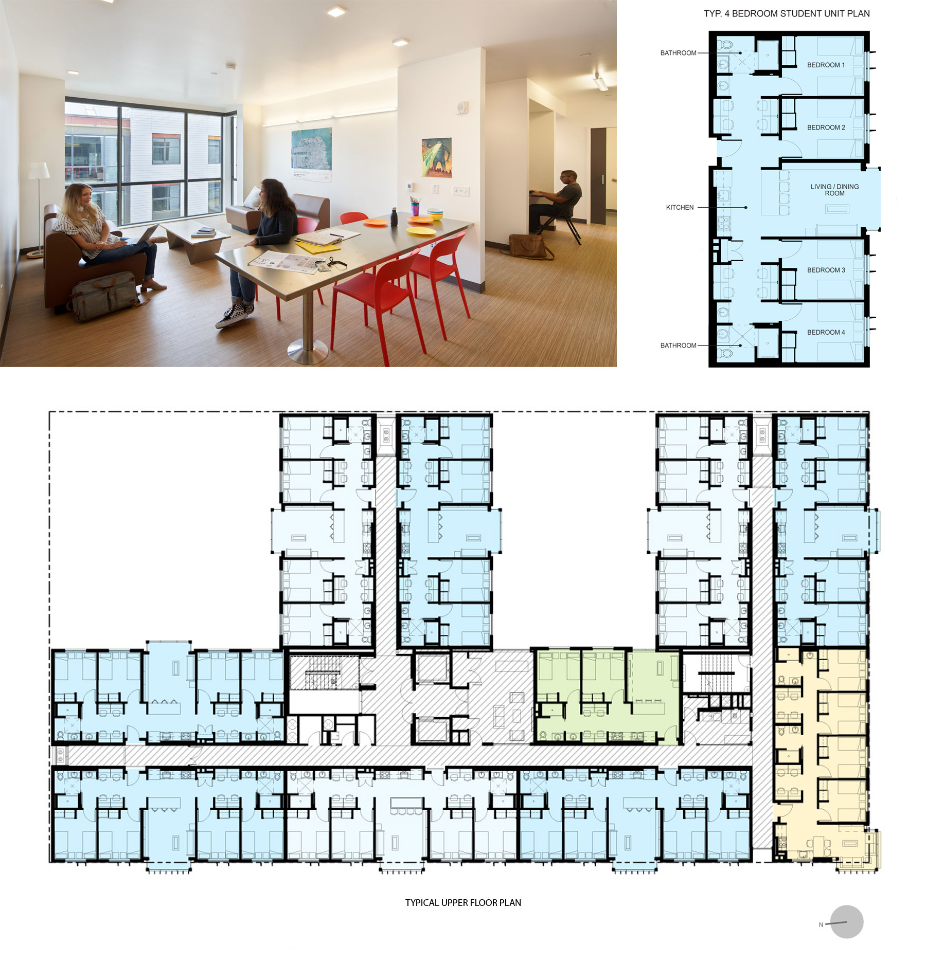 Strong community engagement is important to student success. At Blattner Hall, the community engagement starts within the dwelling unit where two bedrooms flank each side of shared common space including a living, dining, and kitchen. Reinforcing the idea of social equity, each bedroom is the same size and layout. Desks in the hallway for each student double as a space for personal pursuits and as a place to share ideas with roommates. With the projected bay of the living room reaching out toward the public street, students are reminded of the greater community in the surrounding neighborhood.