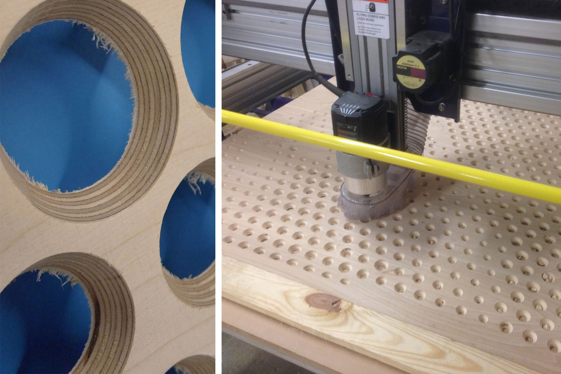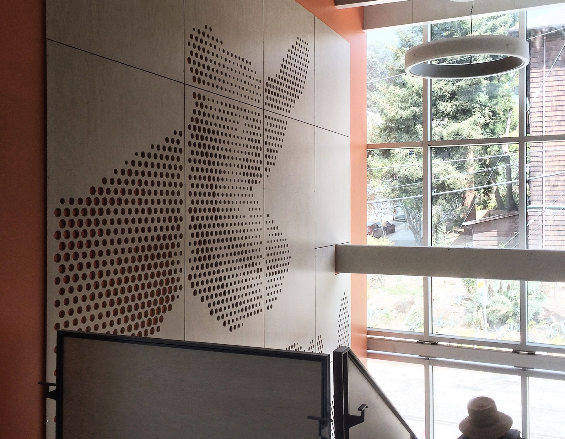 The photographs Anna submitted were abstracted and transposed to the plywood panels. Anna, the College of Engineering, a local fabricator, and the design team worked together to develop a custom pixelated pattern of CNC-routed, beveled holes of different sizes on a brightly colored painted substrate. This process was a cooperation across disciplines and iteratively involved many experimental mock-ups, embodying the design thinking ideas now taught across the Institute.