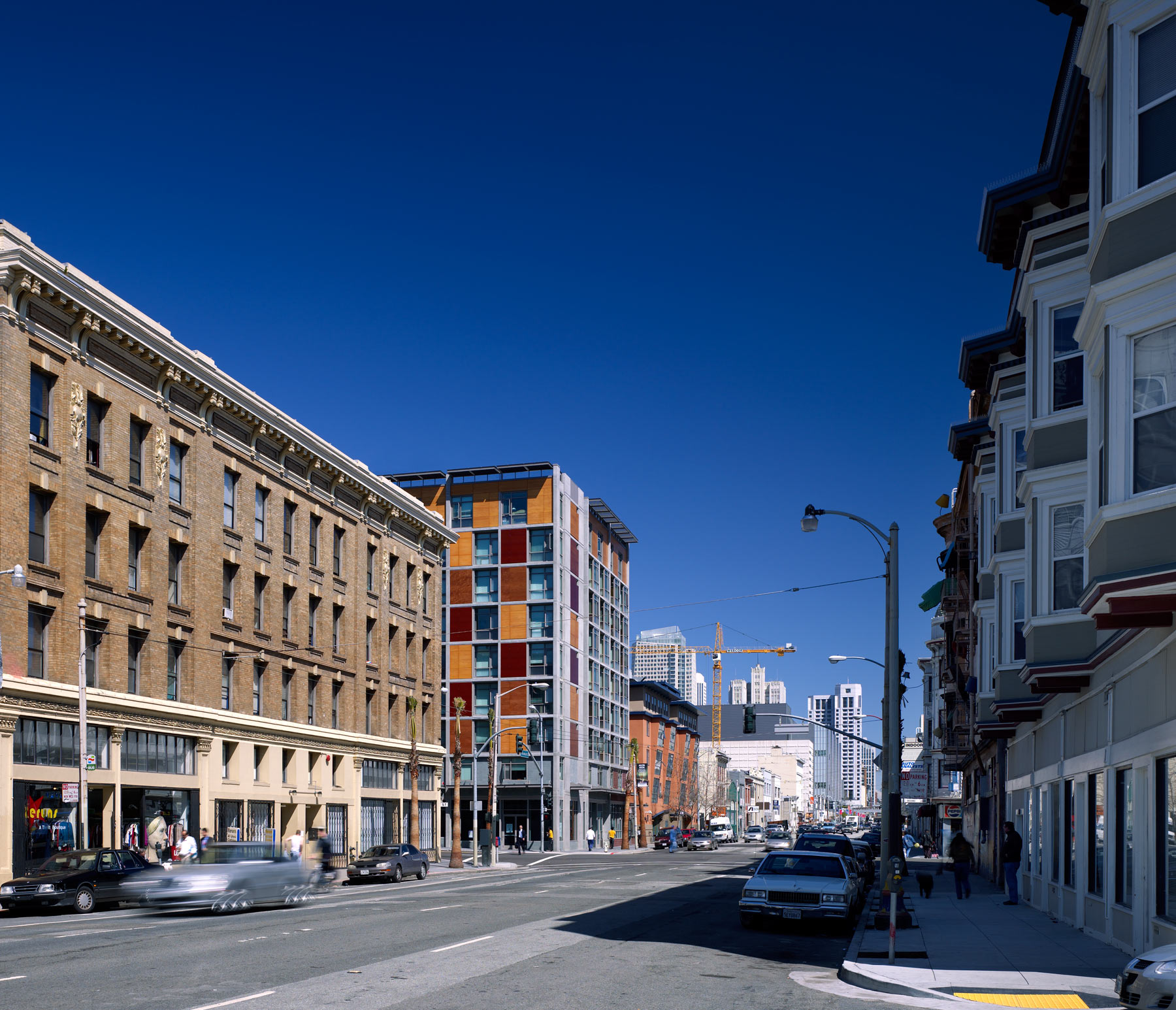 The Plan sought to replace the ruined housing with equally affordable but safer and more livable housing. The Plaza Apartments, previously known as the Plaza Hotel, was the first of these newly constructed properties fully dedicated to serving San Francisco’s neediest and lowest income residents. The replacement of the former building with the new mixed-use development is a critical addition to the revitalization of the neighborhood. Its new ground-floor commercial space, theater entrance, and residential courtyard enhance the streetscape, and the colorful exterior signals a new direction for the neighborhood.